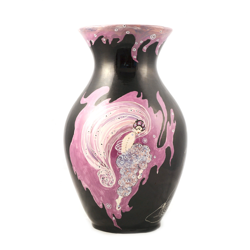 I love all Erte designs so I needed to create this design on ceramics. The dress figure is in shades of purple on a black glazed background and around one side is a carved genie.
